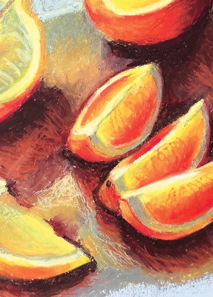 “Segments of light” captures the quiet richness of everyday abundance. Vibrant oranges rest against deep, earthy shadows, their luminous flesh glowing with warmth and vitality. The textured oil pastel strokes create a tactile softness, allowing the light to dance across rind and pulp while grounding the composition in rich umber tones. The fruit becomes more than still life; it becomes a meditation on nourishment, presence, and the beauty found in ordinary moments.